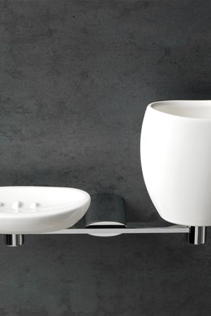 Il porta sapone ed il porta bicchiere sono disponibili sia in una versione da parete con due elementi separati, sia nella versione doppia, che consente di avere entrambi in un unico porta accessori in ceramica. Nella collezione è disponibile anche il dosatore per sapone liquido da parete. Per il lavabo o per il bidet sono inoltre disponibili anche elegantissimi porta sapone da appoggio in ceramica bianca/nera.